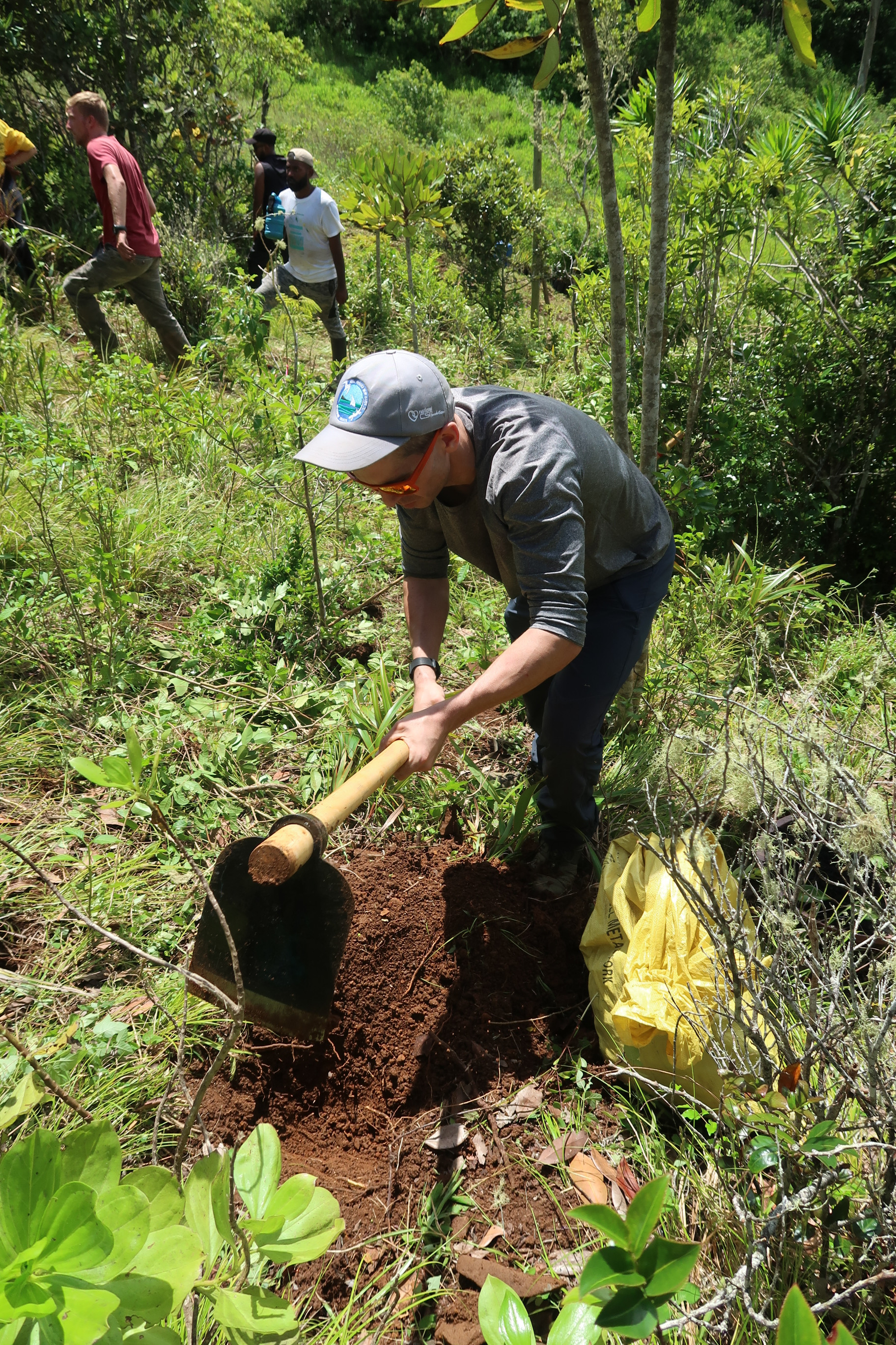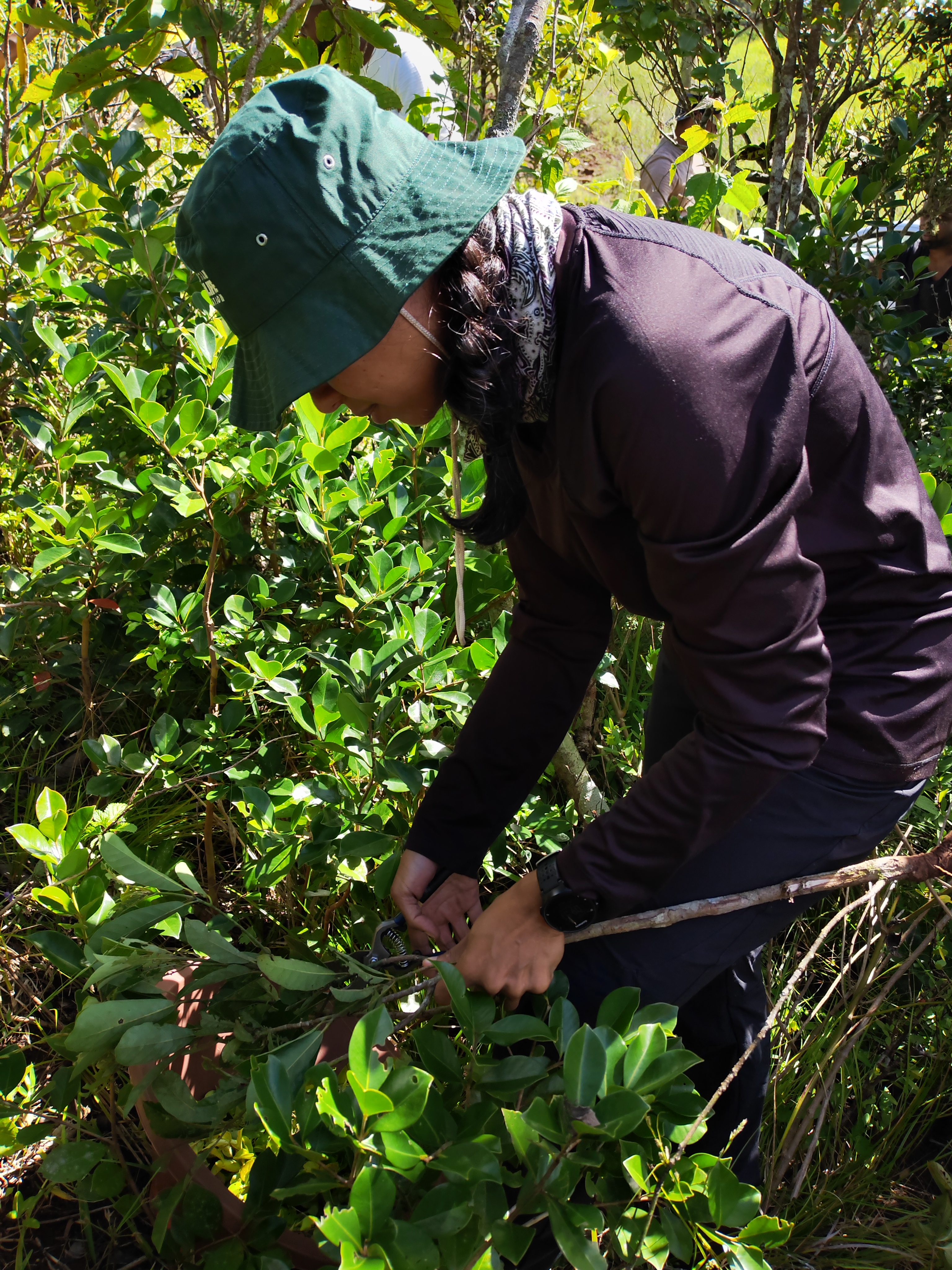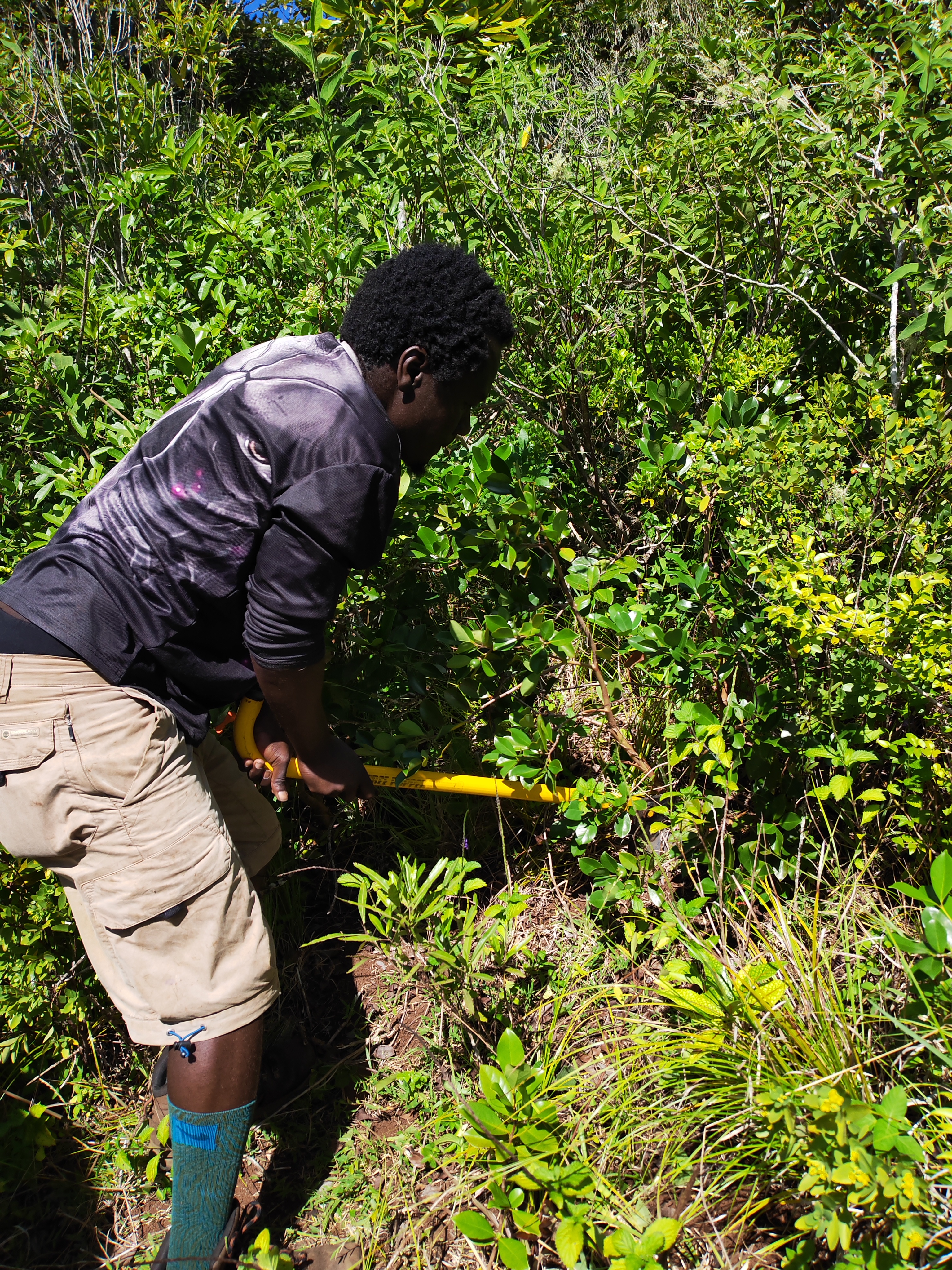 Giani Abajee (Flora Conservation Biologist), organised to split the group into 3 teams. One was focused on the weeding work, with the objective to create space for the native and endemic seedlings to be planted. Another team specialised in mulching. This is a process that consists of cutting in small pieces the removed invasive trees. These pieces would then be put just under the planted trees to keep moisture and prevent invasive weeds from growing rapidly. The third team concentrated on the planting part. This consisted of digging holes, adding compost, putting the plants in soil, adding the mulch, and then watering the plants.