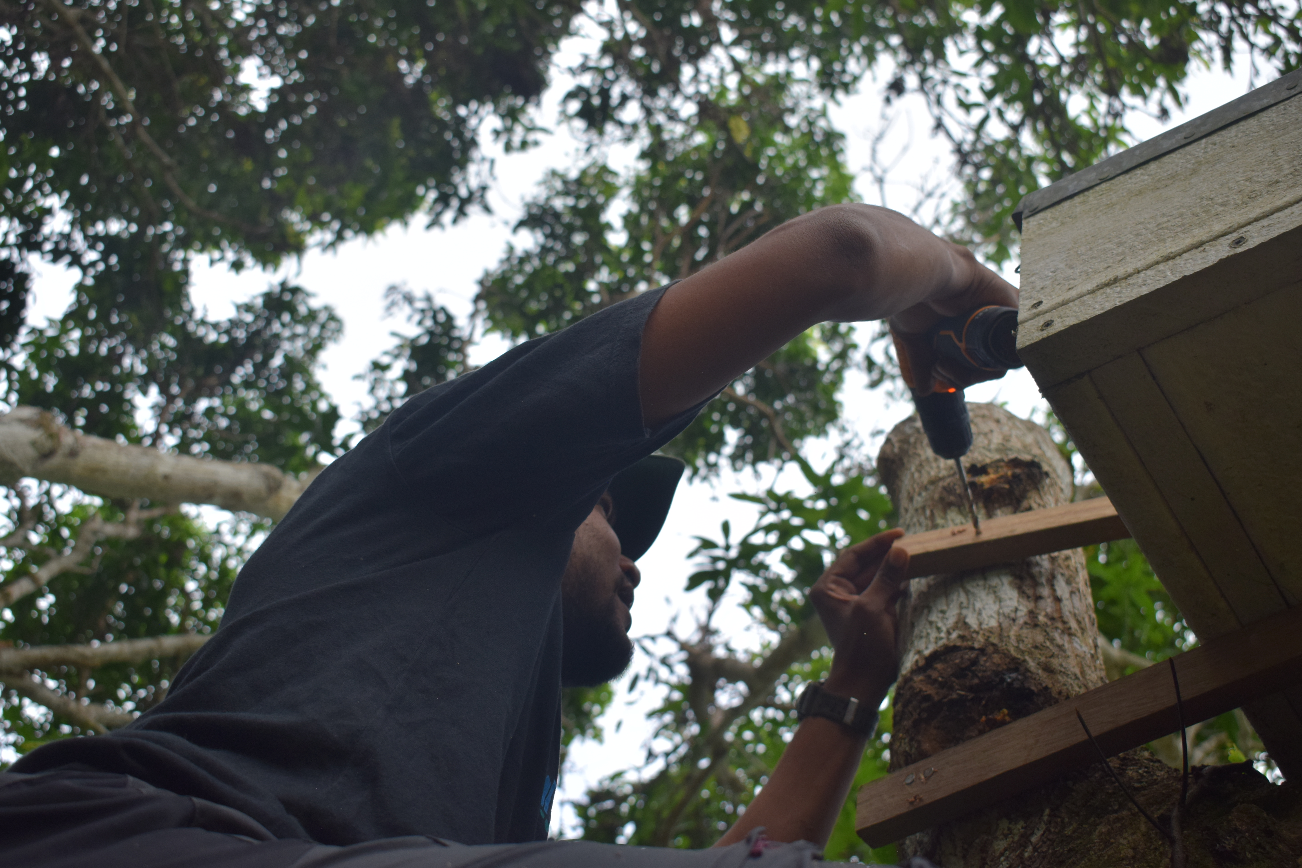 Josua proceeds to climb up the tree. He then nails, some pieces of wood to the nest box, to strengthen it and makes sure that it is prepared to face strong winds. Jauffrey helps by handing his field partner the equipment needed. A battery powered drill is also used to fix the nest box in its place. As soon as it is secure, Josua cleans the box inside and adds some fresh coral sand (nesting material that mimics the substrate found in cliff cavities where the Mauritius Kestrel breeds naturally).
