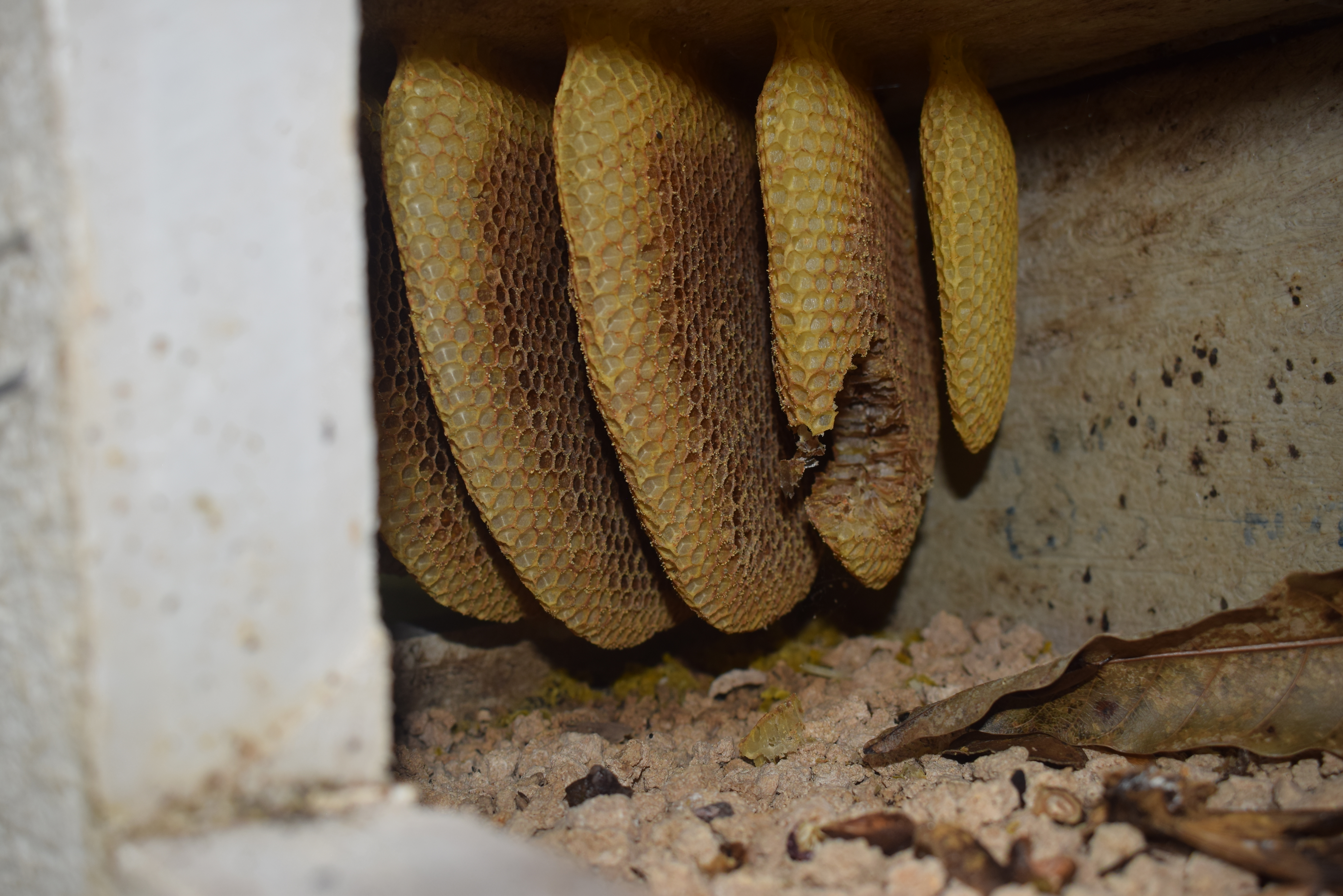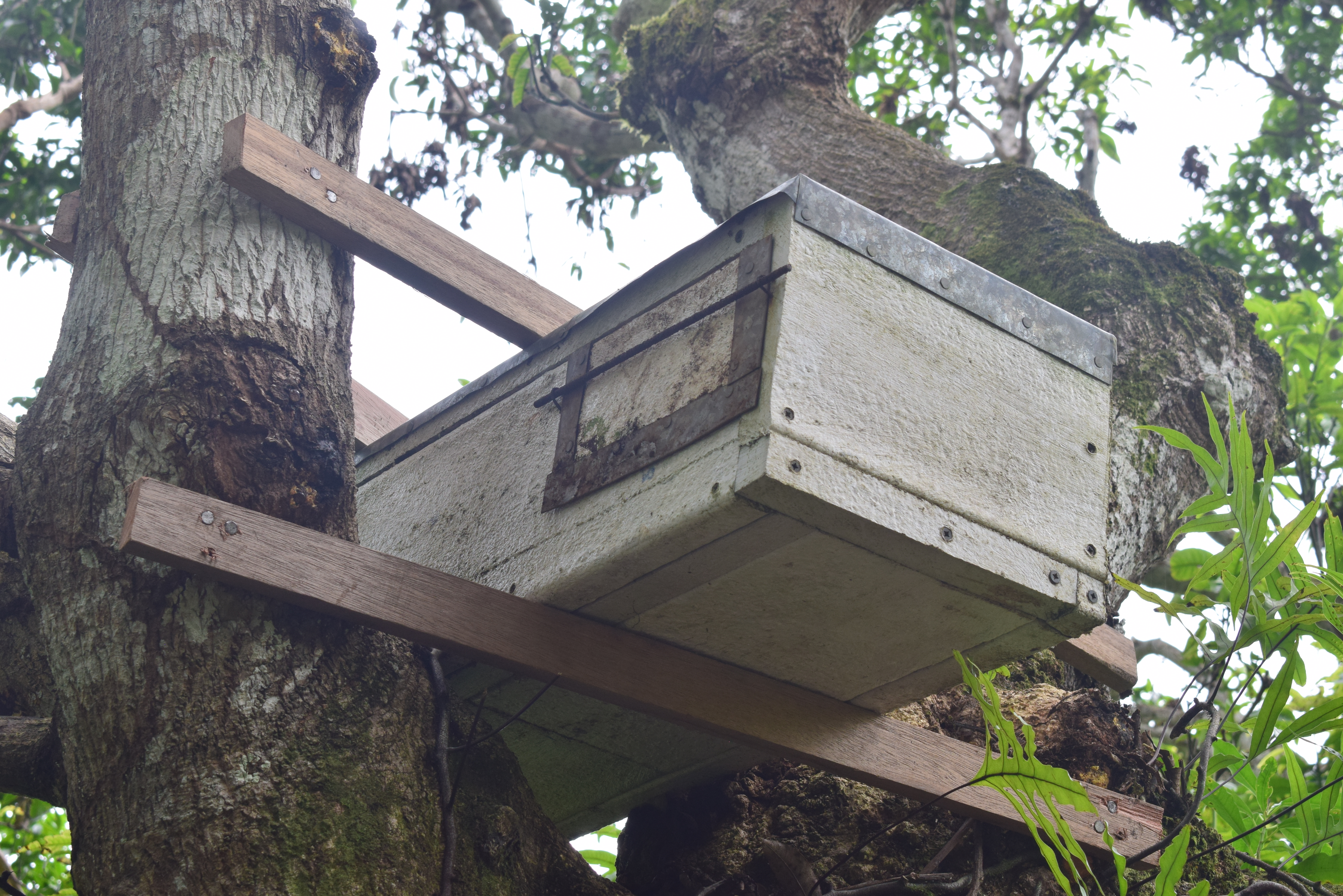 As the maintenance work is completed in the first nest box, the team moves to the next one. A quick observation makes the staff suspect that there might be other species inside the box. Josua takes a cautious look and notices honeybees flying in and out of the nest box, a common observation for the team. “This is not unusual; bees often use nest boxes. We will have to come back another time equipped with bee suits and a smoker to smoke the nest box to remove the bees. We will also remove the honeycomb. Then, we will make a follow-up visit to confirm that the bees have not returned. If they do return, we would then have to keep repeating the process until complete bee removal is successful”, explains Jauffrey.