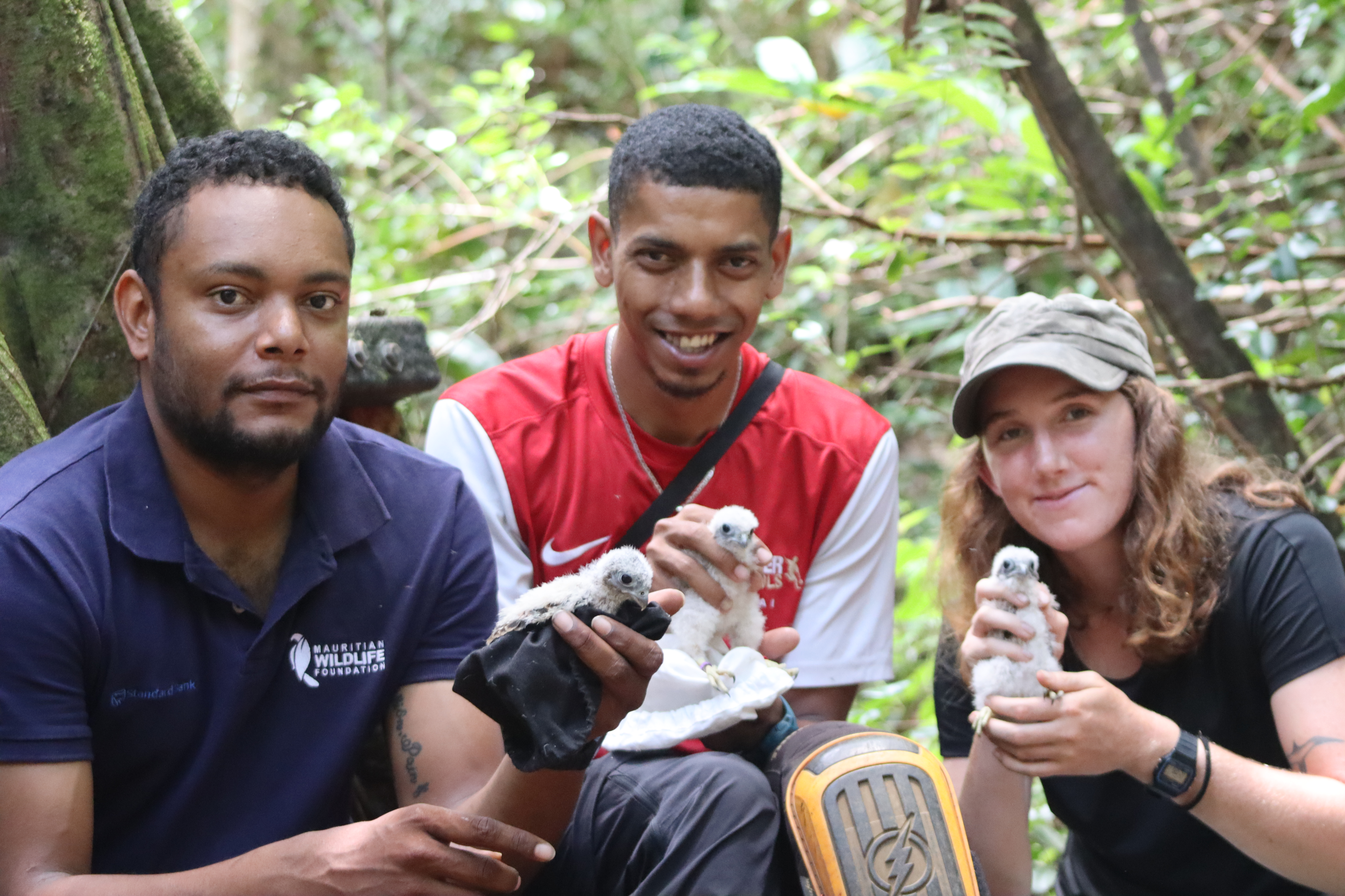 On one of their trips, the members of the fauna team visited Ferney Valley, where three kestrel chicks were examined, and Kestrel Valley, where one chick was assessed. In both Ferney Valley and Kestrel Valley – situated in the Bambou Mountain Range -, the team had to climb trees to carefully retrieve the chicks from the Mauritius Kestrel nest boxes.