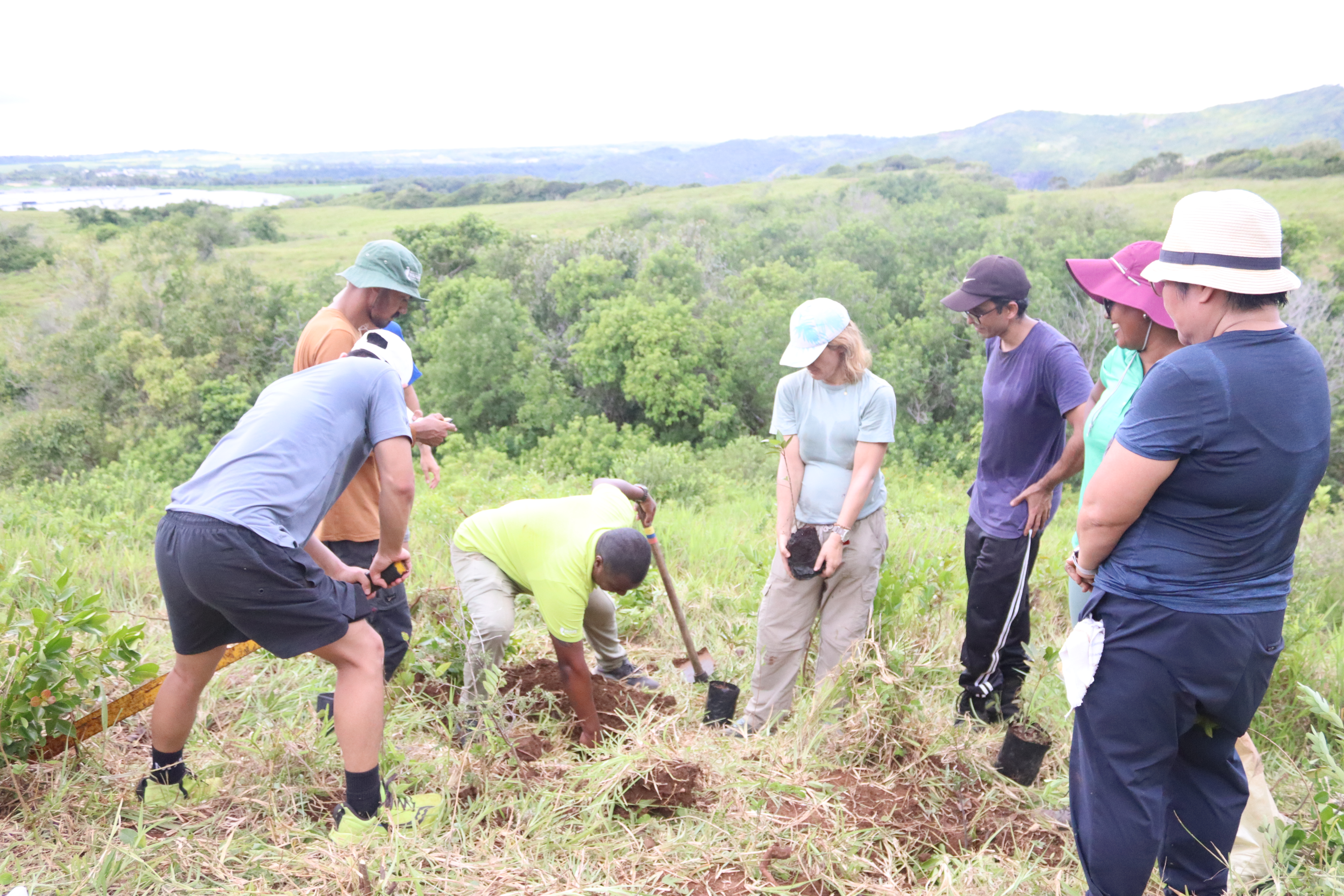 Once the invasive species were cleared, the team carefully prepared the newly freed areas for replanting. They dug holes before placing endemic seedlings into the soil. After planting, they added a protective layer of mulch around each seedling, ensuring that the young trees would retain moisture and thrive in their new environment. Among the species planted were the rare Hibiscus genevii, Syzygium pyneei, and Distephanus populifolius.