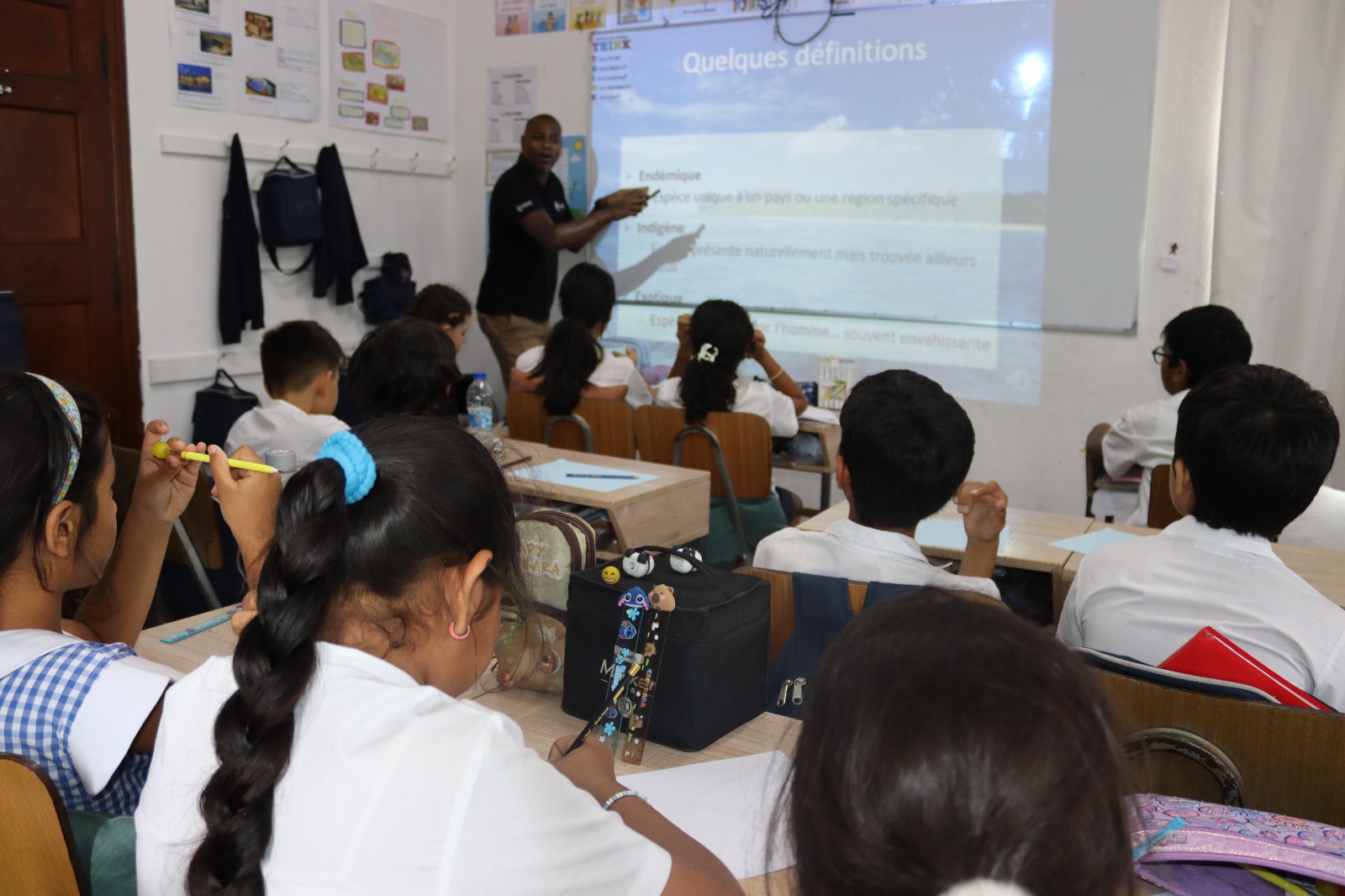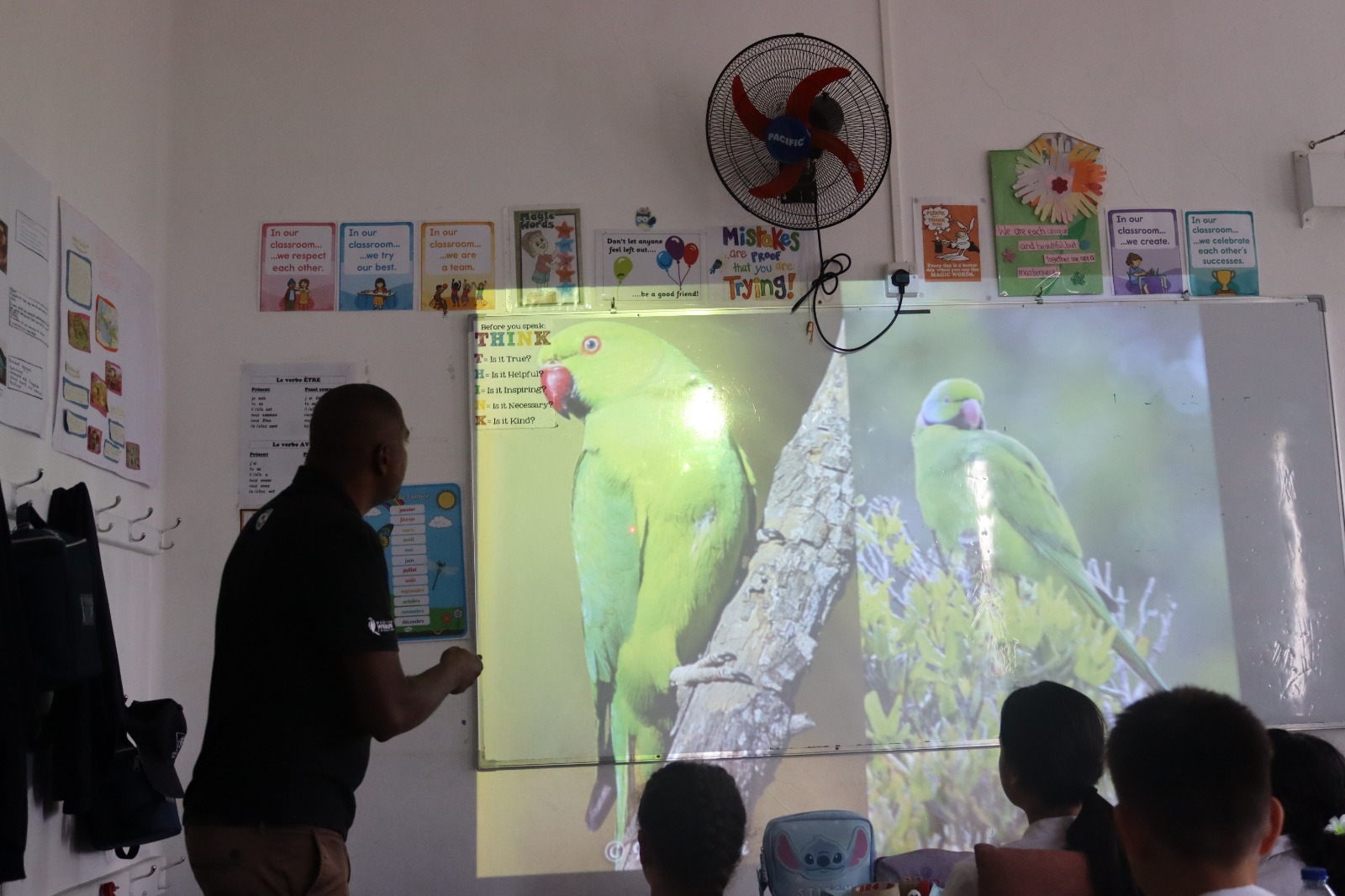 During the activity, students were introduced to words such as endemic, native, and exotic species, helping them understand the difference between species found only in Mauritius and those that have been introduced from elsewhere. They also explored vivid pictures of several iconic Mauritian species, including the Echo Parakeet, the Mauritius Fruit Bat, and the Mauritius Kestrel, allowing them to connect visually with the wildlife they were learning about.